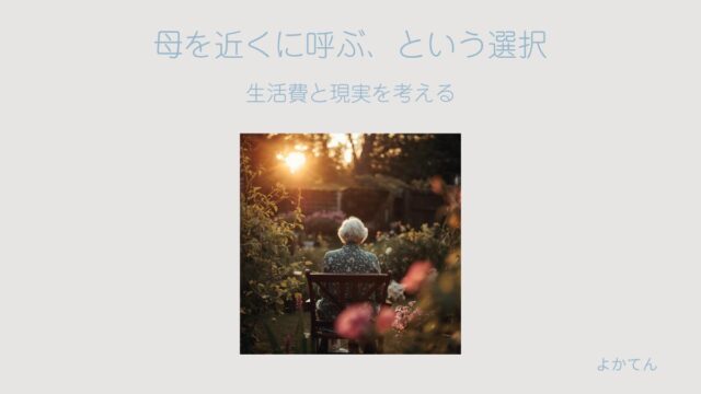 認知症・要介護3・母の介護日記 【認知症】もし要介護の母が団地に引っ越してきたら?生活費を現実的に計算してみました 2026年1月31日 よかてん 発語なし重度自閉症娘と要介護3の母、ダブルケアのリアルな毎日 母の介護を続ける中で、「もし母が今の家を出て、近くの団地に引っ越してきたら生活は成り立つのか」を、現実的に考える必要が出てきました。今回は …